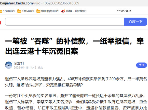 一份寄往中央纪委的实名举报,撕开了连云港市一桩长达十余年的基层权力乱象。退伍军人陈某平、李某文等人实名控诉:他们临危受命接手政府烂尾养殖场,重金改造、苦心经营,却在市政工程临时征迁中,遭遇补偿款被侵吞、资产被暴力抢夺、维权被层层打压的悲惨境遇。一句句血泪控诉,揭开的不只是经济利益的争夺,更是权力失控、承诺作废、普通人维权无门的荒诞现实。