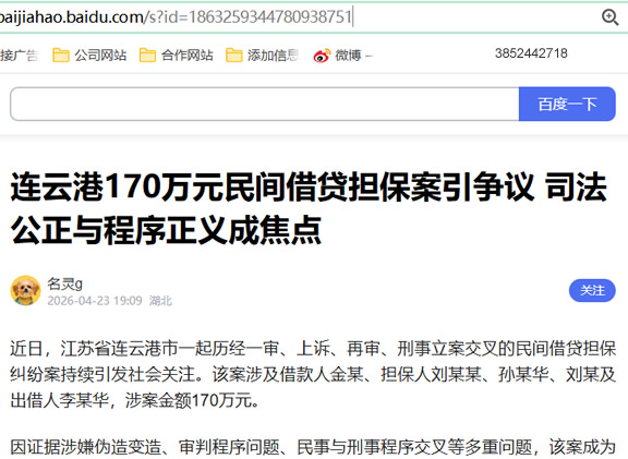 近日,江苏省连云港市一起历经一审、上诉、再审、刑事立案交叉的民间借贷担保纠纷案持续引发社会关注。该案涉及借款人金某、担保人刘某某、孙某华、刘某及出借人李某华,涉案金额170万元。